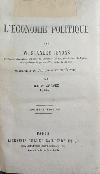 Clique nas imagens para aumentar. STANLEY JEVONS. (William) L'ÉCONOMIE POLITIQUE.Pr... Professeur d’économie politique au University College, [...]. Traduite avec l’autorisation de l’auteur par Henry Gravez, Ingênieur. Troisième Édition. Librairie Germer Baillière et Cie. Paris. S.d. De 15,5x10 cm. Com 189, [i] págs. Encadernação inteira de tela com ferros a ouro na pasta anterior. Exemplar com etiqueta da Livraria Universitária no verso da pasta anterior, e com restauros amadores nas folhas preliminares. Referência: 2511RS271