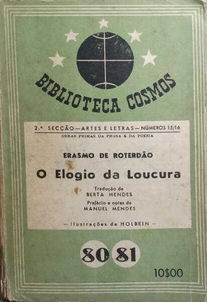 Clique nas imagens para aumentar. ROTERDÃO. (Erasmo de) O ELOGIO DA LOUCURA.Tradução de Berta Mendes. Prefácio e notas de Manuel Mendes. Biblioteca Cosmos: N.º 80/81. 2.ª secção. N.º 15/16 - Artes e Letras, I) Obras primas da prosa e da poesia. Cosmos. Lisboa. 1945. De 19,5x13,5 cm. Com 223, [i] págs. Brochado. Ilustrado no texto com gravuras a preto e branco. Exemplar com ligeiros sinais de manuseamento e alguns picos de humidade. Colecção sobe a Direcção do Prof. Bento de Jesus Caraça (da Universidade Técnica de Lisboa). Referência: 2511RS279
