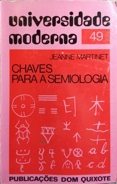 Clique nas imagens para aumentar. MARTINET. (Jeanne) CHAVES PARA A SEMIOLOGIA.[Por]... Licenciada em Letras e conselheira científica do I.N.R.D.P. Traduzido do francês por António José Massano e Isabel Pascoal. Universidade moderna, N.º 49. Publicações Dom Quixote. Lisboa. 1976. De 21x13,5 cm. Com 215, [viii] págs. Brochado. Ilustrado no texto a preto e branco. Exemplar com talão comercial na folha de guarda e tem junto cartão postal editorial. Referência: 2511RS306
