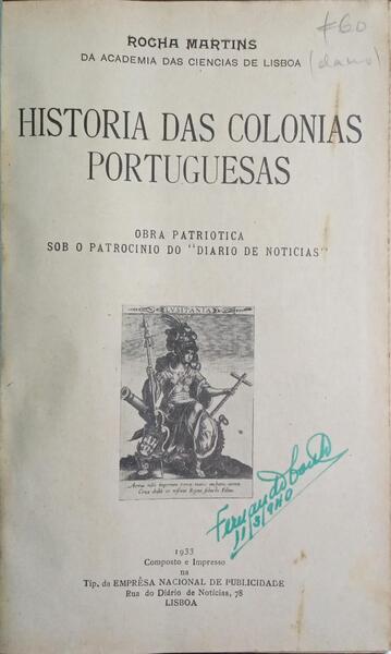 Clique nas imagens para aumentar. ROCHA MARTINS. (Francisco José da) HISTORIA DAS COLONIAS PORTUGUESAS.Obra patriótica sob o patrocinio do 'Diário de Notícias'. [Por] Rocha Martins, da Academia das Ciências de Lisboa. Composto e impresso na Tip. da Emprêsa Nacional de Publicidade. Lisboa. 1933. De 20,5x14 cm. Com 698, [iii] págs. Encadernação inteira de tela com ferros a ouro na lombada e a seco nas pastas. Profusamente ilustrado no texto com mapas, retratos, gravuras e fotografias; em extratexto sobre papel couché com reproduções de obras e mapas desdobráveis. Exemplar com lombada descosida no festo da pasta anterior, e assinatura de posse na folha de rosto. Tem como data de impressão 1994. Referência: 2511RS359
