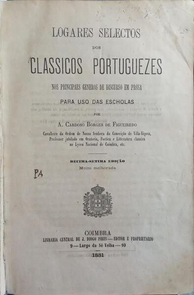 Clique nas imagens para aumentar. BORGES DE FIGUEIREDO. (António Cardoso) LOGARES SELECTOS DOS CLASSICOS PORTUGUEZES.Nos Principaes Generos de Discurso em Prosa. Para uso das escholas. Por... Cavalleiro da Ordem de Nossa Senhora da Conceição de Villa-Viçosa, [...]. Decima-setima edição muito melhorada. Livraria Central de J. Diogo Pires - Editor e Proprietario. Coimbra. 1881. De 21,5x14 cm. Com 431 págs. Encadernação da época inteira de pele, com rótulo e ferros a ouro na lombada. Folhas de guarda marmoreadas. Exemplar com danos superficiais na lombada, falta de uma folha provavelmente de guarda e ocasionais notas coevas a lápis. Referência: 2511RS365
