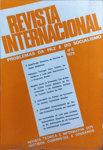 Clique nas imagens para aumentar. REVISTA INTERNACIONAL, PROBLEMAS DA PAZ E DO SOCIALISMO, ANO II, N.º 8, AGOSTO 1975.Revista Teórica e Informativa dos Partidos Comunistas e Operários. Director da Publicação: Cândida Ventura. Editora Avante. Lisboa. 1975. De 21x14,5 cm. Com 195, [xii] págs. Brochado. Ilustrado com tabelas. Referência: 2511RS518