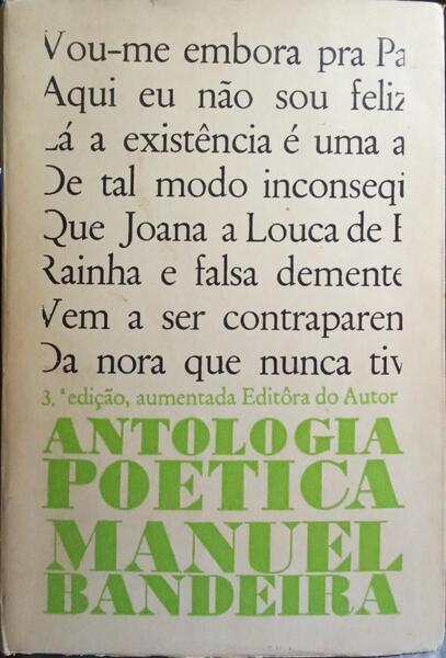 Clique nas imagens para aumentar. BANDEIRA. (Manuel) ANTOLOGIA POÉTICA.3.ª Edição. Editora do Autor. Rio de Janeiro. 1961. De 21x14,5 cm. Com 236 págs. Brochado. Exemplar com etiqueta do Centro do Livro do Brasil na badana anterior. Referência: 2511RS559