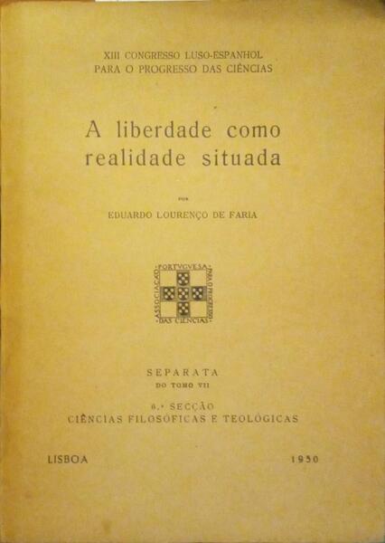 Clique nas imagens para aumentar. LOURENÇO DE FARIA. (Eduardo) A LIBERDADE COMO REALIDADE SITUADA.XIII Congresso Luso-Espanhol para o Progresso das Ciências. Separata do Tomo VII, 6.ª Secção: Ciências Filosoficas e Teológicas. Lisboa. 1950. De 24,5x17,5 cm. Com [i], 10 págs. numeradas de 208 a 217. Brochado. Exemplar com assinatura de posse na primeira folha e sublinhados a lápis. Referência: 2511RS691