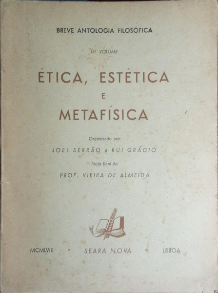 Clique nas imagens para aumentar. SERRÃO. (Joel) e Rui Grácio. ÉTICA, ESTÉTICA E METAFÍSICA. [3.º VOL.]III Volume. Breve antologia filosófica. Organizado por Joel Serrão e Rui Gerácio. Nota final do Professor Vieira de Almeida. Seara Nova. Lisboa. 1958. De 21x15 cm. Com 399 págs. Brochado. Referência: 3003NL472
