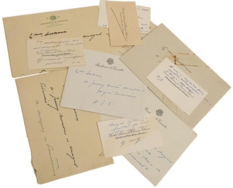 Documentary set consisting mainly of correspondence from Salazar sent to Jenny Aragão Teixeira, but including a letter from her to Salazar, a letter from the Minister of Education, Francisco Leite Pinto forwarded to Maria Jenny by Salazar, a card from António Ferro, two cards from the Office of the Minister of Public Works, and a letter from Queen Amélia addressed to Salazar and offered by him to Maria Jenny. It also includes at least three documents belonging to the documentary collection of Emídio Mendes, Maria Jenny's father, and which were sent to him by António de Oliveira Salazar. All the documents are unpublished, no extracts have ever been transcribed or any reference made to them. HISTORICAL, POLITICAL AND BIOGRAPHICAL VALUE AND IMPORTANCE OF THE ARCHIVE: Very important archive for the study of António de Oliveira Salazar's private life, and the way he related to a wide range of people. This aspect of his biography has been studied little or not at all by researchers with scientific methods, whether or not they come from the university world. The only exception is the journalistic research, with quality, but with a tone of some sensationalism by Felícia Cabrita. They contain documents of exceptional archival, symbolic and heritage value. Even without going into the analysis of the contents, the study of the physical appearance of the documents shows António de Oliveira Salazar in an unusual light, since, for example, certain letters are very long and include erased words, and others added between the lines, which show hesitations in the way one should express oneself and a strong commotion. All this is the opposite of official documents which are characterised by being written without erasures and by their conciseness. This documentary set is especially important because it allows the study of the members of a family who despite having played very relevant roles in political life, in the banking sector, in the business sector and having maintained very close relations with Salazar are today almost completely unknown. So much so that the recent edition of the Salazar Diaries, where the father, daughter and family together are referred to more than 400 times does not present any biographical or contextualisation data of any of them. Thus this Archive allows new perspectives to be opened on one of the most influential personalities of the 20th Century, in Portugal, who governed the country between 1928 and 1968 and on the elites supporting the Estado Novo. BIOGRAPHICAL DATA ON THE PRODUCERS OF THE ARCHIVE: Maria Jenny Bastos Mendes de Aragão Teixeira (1920? - 2000?) married João José Gomes de Aragão Teixeira with whom she had four children: Emídio de Aragão Teixeira (4-2-1943 -) who completed the 8th CEORN - Naval Reserve Officers Special Course. Navy Class, No. 63, was promoted to 2nd Lieutenant, on 29 April 1966 and served in Guinea as Commander of the LFP - Small Inspection Boat, Deneb, from 1966 to 1968; Margarida Maria Mendes de Aragão Teixeira (19-07-1944 -); João Pedro Mendes de Aragão Teixeira (25-08-1948 -); Pedro José Mendes de Aragão Teixeira (10-01-1953 -). She was the daughter of Emídio Guilherme Garcia Mendes (Ervedal do Alentejo, 1886 - Estoril, 1958) and Berta Laura Pereira Bastos Mendes. Emídio Mendes graduated in law from the University of Coimbra in 1909 (he participated in the famous student strike in 1907), he was a lawyer, Administrator of the 4th District of Lisbon, Registrar of the Civil Registry, Deputy to the National Constituent Assembly in 1911, for the circle of Santa Comba Dão, Administrator of the Casa Bancária Fonseca Santos & Viana and then Vice-President of its Board of Directors when this house, in 1937, became a public limited company. He was also Chairman of the Supervisory Board of Companhia dos Caminhos de Ferro Portugueses (Portuguese Railways). He is referred to 182 times in Salazar's diaries, particularly in the 1930s, when he came to meet Salazar twice a month to address issues relating to the reform of the Caixa Geral de Depósitos and the functioning of the banking system at the time. (See more biographical data in the archival description in the link below). It was through her father that Jenny met Salazar and became his friend from a young age, when she went to his house (see letter of 20 April 1950) and accompanied him to the end. She was present on many solemn occasions, with the tickets and other documents ensuring access offered and sent by Salazar. Participated prominently in the famous ceremony of thanks by Portuguese Women to Salazar on 11 January 1948, which included the unveiling of a statue, by Leopoldo de Almeida, of a woman staring at the sky as a sign of gratitude, speeches by the promoters of the tribute and Salazar's response. In Salazar's diaries, she is mentioned 232 times, between 4 December 1943 and 12 July 1968. She was a Catholic with a high experience of faith and contributed a significant amount to the final phase of the construction of the Sanctuary of Christ the King in Almada, being inscribed in the Benevolent Wing, as well as with periodic contributions to the Missionary work of the Catholic Church, an activity in which she was supported by Salazar, as is evident from various documents in this Archive. MAIN FEATURES OF THE ARCHIVE: The Archive consists of a total of 117 documents, of which 66 are undated (of these 18 have the day and month but not the year). The remaining 51 documents include 22 from the 1940s, 20 from the 1950s, 6 from the 1960s, 2 from the 1970s and 1 from the 1980s. If we distribute the undated documents proportionately for each decade we obtain the following result: 52 from the forties, 50 from the fifties and 12 from the sixties. Most of the documents were sent to Maria Jenny by António de Oliveira Salazar, a total of 109 and 3 were sent to her father. The remainder were sent by António Ferro; Maria de Jesus Caetano Freire, Salazar's housekeeper; and collected by