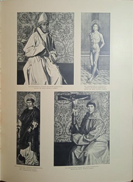 Clique nas imagens para aumentar. SANTOS. (Reynaldo dos) NUNO GONÇALVES.Pintor Português do Século Quinze e o seu Retábulo para o Mosteiro de S. Vicente-de-Fora. Phaidon Press. London. MCMLV [1955] De 36x27 cm. Com 15, [xli] págs. Encadernação em tela. Profusamente ilustrado, reproduzindo o conjunto do Políptico em folhas dobradas, seguidas de trinta e seis pormenores de página inteira, dez dos quais coloridos. Exemplar com mancha de oxidação na lombada, picos de acidez nas capas e mancha de oxidação na folha de guarda anterior e posterior. Obra de grande interesse histórico e artístico centrada no estudo da obra de Nuno Gonçalves, autor do famoso Políptico de S. Vicente e da notável galeria de retratos da corte portuguesa do século XV. Apresenta uma análise clara e documentada da obra de Nuno Gonçalves, seu estilo e significado, correlacionando-a com as principais correntes de Arte Europeia à época.