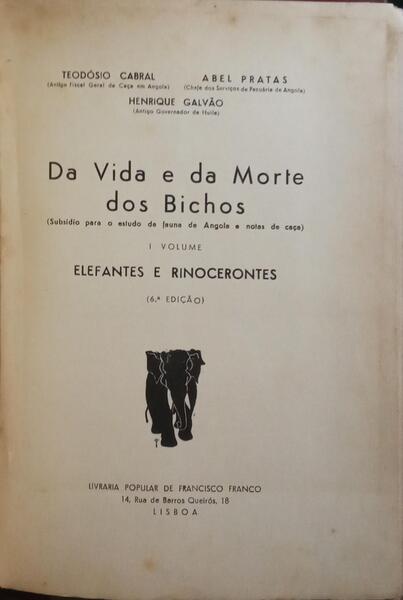 Clique nas imagens para aumentar. CABRAL. (Teodósio), Abel Pratas e Henrique Galvão. DA VIDA E DA MORTE DOS BICHOS. [ED. MISTAS]Subsídio para o estudo da fauna de Angola e notas de caça. [Por]… Antigo Fiscal Geral de Caça em Angola, … Chefe dos Serviços de Pecuária de Angola, … Antigo Governador da Huíla. Livraria Popular de Francisco Franco. Lisboa. S.d. 5 Volumes de 24x17 cm. Com 245, [ii]; 21, [ii]; 233, [iv]; 234; 252, [i] págs. Encadernações inteiras de percalina com ferros a ouro nas lombadas. Ilustrados com mapas, gravuras e fotografias a preto e branco, e em extratexto, no primeiro volume, com um mapa a cores e desdobrável do Gongo Francês, sobre papel couché. Exemplar preservam as capas de brochura originais, picos de humidade e assinatura de posse nas folhas preliminares; IV Volume contém um recorde de jornal com artigo e uma foto do cientista Lawrence Frank, e com acastanhamento das páginas 226 e 227. Contém neste conjunto os seguintes volumes e edição: Último volume é da autoria exclusiva de Henrique Galvão. Obra de referência no domínio da literatura venatória portuguesa, apresentando uma selecção de escritos em que se descrevem a vida, a psicologia e os costumes dos animais bravios do Sul de Angola, tal como os autores os observaram. Trata-se de um importante subsídio para o conhecimento da fauna angolense, pioneiro no domínio bibliográfico ultramarino, e ao qual se juntam, no quinto e último volume, vários escritos com relatos de caçadas que, no quadro geral do assunto objectivo, ilustram a matéria em exame. Descrevem-se com grande detalhe elefantes, rinocerontes, hipopótamos, girafas, crocodilos, javalis, leões, búfalos, gorilas, leopardos e antílopes, entre outros. Referência: 2411RS312