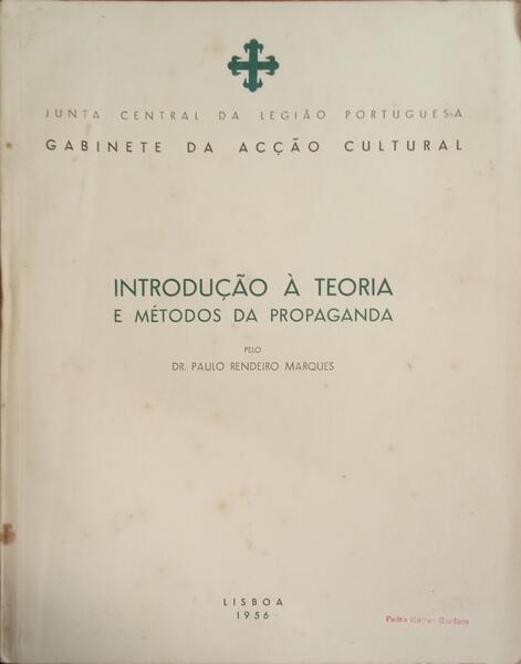 Clique nas imagens para aumentar. RENDEIRO MARQUES. (Paulo) INTRODUÇÃO À TEORIA E MÉTODOS DA PROPAGANDA.Pelo Dr... Junta Central da Legião Portuguesa. Gabinete da Acção Cultural. Lisboa. 1956. De 27x21 cm. Com [ii], 28 págs. Brochado. Exemplar com picos de acidez nas capas de brochuras e carimbo oleográfico de posse na capa anterior. Referência: 2501DG266