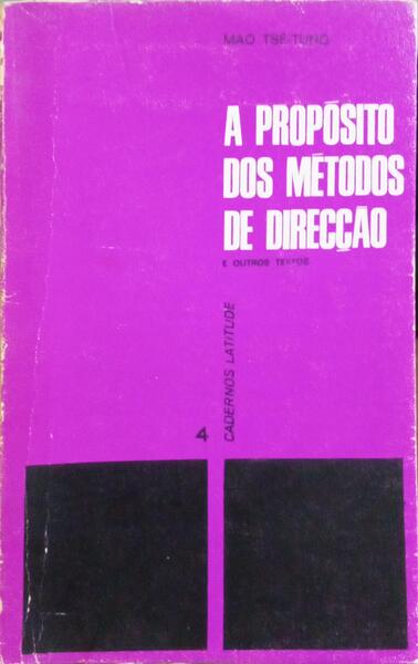 Clique nas imagens para aumentar. MAO TSÉ-TUNG. A PROPÓSITO DOS MÉTODOS DE DIRECÇÃO.E outros textos. Prefácio, colecção e tradução por José Manuel Mendes das Oeuvres Choisies de Mao Tsé-Toung. Colecção Cadernos Latitude, 4. Edições Latitude. Porto. S.d. De 18x11,5 cm. Com 124, [iv] págs. Brochado. Exemplar com sinais de manuseamento na lombada e nas capas, etiqueta da Drugstore Apolo 70 na folha de guarda e sublinhados e notas marginais a tinta. Referência: 2502MA088