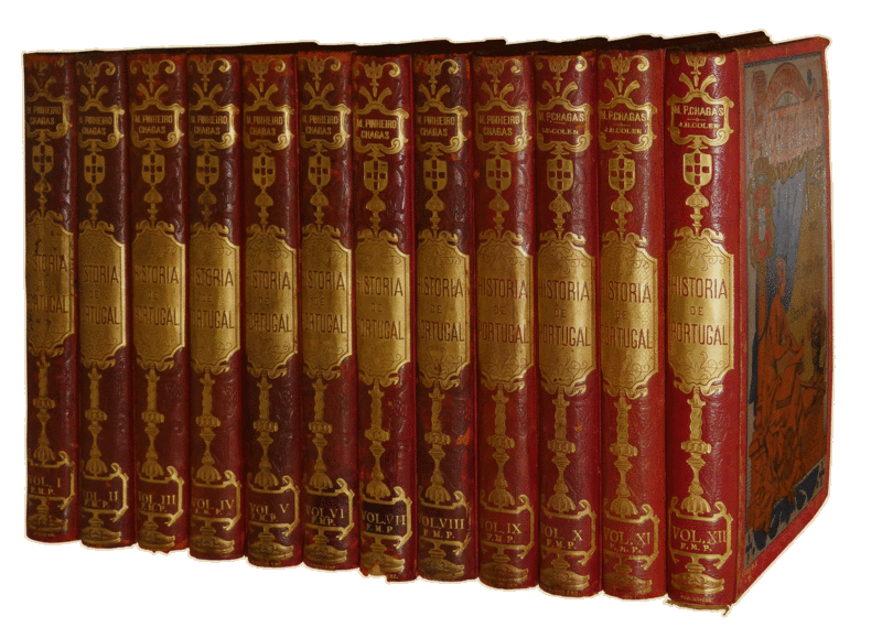 Clique nas imagens para aumentar. PINHEIRO CHAGAS. (Manuel) et al. HISTÓRIA DE PORTUGAL. [3.ª EDIÇÃO - 12 VOLUMES]Popular e Illustrada. Terceira edição. [Continuada desde a chegada de D. Pedro IV à Europa até à morte de D. Maria II por J. Barbosa Cohen e d’ahi até aos nossos dias por Marques Gomes]. Empreza da Historia de Portugal, Sociedade Editora. Lisboa. MDCCCXCIX [1899] – 1907. 12 Volumes de 30x21 cm. Com xx, [ii], 624; 638; 640; 640; 635; 638; 638; 626, [iii]; vii, 647; 632; 642; 600, xliv págs. Encadernações do editor executadas por Alfredo David e por Paulino, com lombadas em pele com elaborados ferros a ouro e pastas em tela vermelha com belas estampas coloridas. Folhas de guarda decorativas, com diferentes padrões em cada volume. Ilustrado com gravuras de página inteira e outras intercaladas no texto, todas a preto e branco, com retratos de personagens da História de Portugal, com reproduções de monumentos e recriações de acontecimentos históricos e brasões. Inclui também um extratexto, em face da folha de rosto, com o retrato do autor sobre papel couché. Texto impresso em duas colunas, separadas por filete simples. Exemplar com as iniciais F.M.P. gravadas a ouro no pé da lombada. Terceira edição rara e significativamente ampliada de uma das obras fundamentais da historiografia portuguesa. Destaca-se pela abrangência cronológica, sendo a primeira a traçar uma perspectiva liberal sobre o percurso histórico nacional até ao final do reinado de D. Carlos em 1908. A sua ampla difusão e acessibilidade contribuiu para a formação da consciência histórica das elites nacionais até ao aparecimento da História de Barcelos, dirigida por Damião Peres, a partir de 1928. A par dos romances históricos de Camilo Castelo Branco e da História de Portugal de Oliveira Martins, Pinheiro Chagas contribuiu para forjar uma imagem negativa da dinastia reinante no Portugal constitucional e assim, involuntariamente, para a sua queda em 1910. Páginas preliminares do primeiro volume com o prólogo desta edição, assim como os da primeira e da segunda. As últimas páginas de cada volume contêm uma explicação das respectivas gravuras e um índice de conteúdos. As últimas páginas em numeração romana do 12.º volume apresentam um extenso índice geral alfabético de todas as gravuras que ilustram os anteriores doze volumes. A 3.ª edição da História de Portugal de Manuel Pinheiro Chagas foi publicada em 14 volumes entre 1899 e 1909, ampliando significativamente o escopo e a profundidade da narrativa original. Enquanto a 1.ª edição (1867-1874) se cingia a oito volumes, esta edição alargou-se com mais seis, que abarcam o período que vai desde a chegada de D. Pedro IV à Europa até ao fim do Reinado de D. Carlos. Os volumes IX, X e XI foram elaborados por José Augusto Barbosa Colen (até à morte de D. Maria II) e o XII por Marques Gomes. Joaquim Alfredo Gallis foi o autor dos dois últimos volumes dedicados ao Reinado de D. Carlos (1890-1908) com o subtítulo: Um Reinado Trágico. A primeira edição da História de Portugal surgiu sob o pseudónimo coletivo de "Sociedade de Homens de Letras". Pinheiro Chagas justificou esta escolha com a intenção inicial de contar com a colaboração de outros autores, embora tenha sido o principal responsável pela obra. A obra de Pinheiro Chagas representa uma narrativa histórica extensa, baseada em trabalhos de historiadores nacionais e estrangeiros como Ferdinand Denis, H. Schaefer, Prescott, Coelho da Rocha, Herculano e Rebelo da Silva. Caracteriza-se por traços fundamentais da narrativa liberal: teoria política e voluntarista da formação de Portugal, inspirada em Alexandre Herculano; rejeição de tradições míticas de fundação ainda comuns na primeira metade do século XIX – como o milagre de Ourique e as Cortes de Lamego; adoção da tese da aliança da coroa com as classes populares contra as ordens privilegiadas; ausência de feudalismo em Portugal; valorização do municipalismo e da descentralização; e um juízo crítico acerca do absolutismo, responsabilizando este, juntamente com a Inquisição e a Companhia de Jesus, pela decadência nacional. Em todos estes pontos, Pinheiro Chagas seguia de perto a filosofia da história de Alexandre Herculano, sem esquecer o seu providencialismo abstrato e a sua teoria relativa à função do indivíduo na história. No que respeita ao juízo negativo sobre os monarcas da dinastia de Bragança (com exceção de D. Pedro V e de D. Luís), bem como à aliança luso-britânica desde o século XVII, o autor aproximava-se da crítica negativa que, a este respeito, viriam a desenvolver autores republicanos como Teófilo Braga, Consiglieri Pedroso ou José de Arriaga. Manuel Joaquim Pinheiro Chagas (Lisboa, 1842 – Lisboa, 1895) foi um reputado jornalista, escritor e divulgador histórico do século XIX. Filho de um major liberal, formou-se no Colégio Militar, na Escola do Exército e na Escola Politécnica, mas enveredou pela carreira jornalística, colaborando em periódicos como A Revolução de Setembro e O Diário da Manhã. Embora tivesse a patente de capitão, nunca exerceu funções de combate, dedicando-se à escrita de folhetins, críticas literárias e obras historiográficas, como a sua obra magna História de Portugal. Foi também deputado em nove legislaturas, ministro da Marinha (1883-1886), professor no Curso Superior de Letras e membro de instituições como a Academia das Ciências. Reconhecido pelos contemporâneos pela sua retórica e erudição, Pinheiro Chagas deixou um legado historiográfico e literário que moldou a consciência histórica das elites portuguesas até ao advento da República. José Augusto Barbosa Colen (Lisboa, 1849 – Lisboa, 1917) foi jornalista, ensaísta e polemista, com um percurso profundamente marcado pela militância ideológica e pela atividade crítica em publicações como A Actualidade, A Opinião 