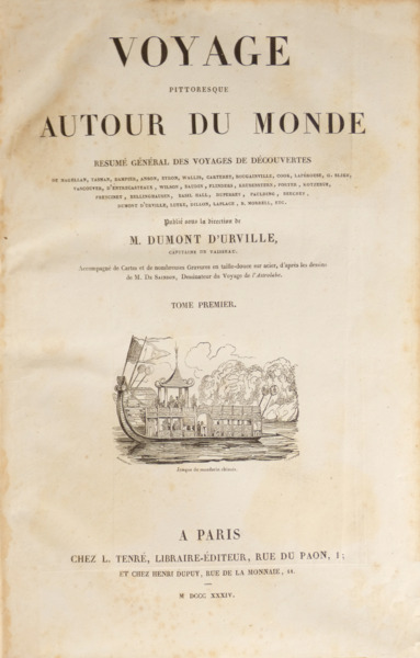 Profusely illustrated with 278 engravings on glossy paper, etched in steel from drawings by Louis-Auguste de Sainson, official draughtsman of the expedition of the corvette Astrolabe (1826-1829). It includes six fold-out maps engraved by A. Tardieu: two general maps (one of the world and one of the Pacific Ocean) and four specific maps of the archipelagos of Hawaii, Tahiti, Tonga and New Zealand. These engravings constitute an invaluable visual record of the peoples, landscapes and customs of the Pacific, with particular emphasis on Oceania. The iconography includes ethnographic portraits, landscape views, scenes of daily life and ceremonies, as well as representations of fauna and flora, offering a documentary collection of exceptional historical and artistic value. Text arranged in two columns, decorated with a woodcut vignette depicting a Chinese vessel on the title page. Copy with the general map of the world preceding the introduction to the first volume torn and loose, with amateur restorations. The tears do not affect the text area or compromise readability. Pages 555 to 558 of the second volume are loose. Rare first edition of this fundamental summary, published simultaneously by L. Tenré and Henri Dupuy. The work was written partly by Louis Reybaud and partly by Dumont d'Urville, as indicated in the bibliographic repertoires of the time. Very important work of 19th-century French geographical literature, constituting a masterful synthesis of the great maritime discoveries from Ferdinand Magellan to contemporary expeditions. It represents the culmination of the French tradition of scientific and popular travelogues, offering the educated public of the time a complete overview of oceanic explorations through a fluid and pedagogically structured narrative. The work stems from the need expressed in the introduction to make the discoveries of major scientific expeditions accessible to the general public, whose official publications, due to their luxury and high cost, remained out of reach for most readers. Dumont d'Urville, with the help of Louis Reybaud, devised an innovative format: a fictional voyageur — 'sorte d'Anacharsis circum-navigateur' — who synthesises the experiences of all the great navigators in a single circumnavigation, thus avoiding the tedious repetitions and overly technical nautical data that characterised the original accounts. The Voyage Pittoresque was part of the scientific popularisation movement of the first half of the 19th century, a period when France sought to rival England in the field of ocean exploration. The work summarises the results of the expeditions of l'Uranie (Freycinet), la Coquille (Duperrey) and l'Astrolabe (Dumont d'Urville), the three major French scientific campaigns of the Restoration, establishing an overall narrative that highlights the French contribution to global geographical knowledge. The structure of the work follows a geographical logic centred on the Pacific Ocean, which Dumont d'Urville proposes to divide into four major regions: Polynesia, Micronesia, Malaysia and Melanesia — an innovative ethnographic division based on the physical and cultural characteristics of the peoples, which will have a lasting influence on the human geography of Oceania. This systematisation, outlined in the introduction, constitutes one of the first attempts at scientific classification of the peoples of the ocean according to modern anthropological criteria. Jules-Sébastien-César Dumont d'Urville (Condé-sur-Noireau, 1790 – Meudon, 1842) was one of the most distinguished French explorers of the 19th century, a naval officer who commanded two scientific circumnavigation expeditions aboard the Astrolabe (1826-1829 and 1837-1840). He participated in the process of identifying and acquiring the Venus de Milo for France in 1820, determined the location of the wreck of La Pérouse in Vanikoro (1828) and explored Antarctica extensively, naming the region he discovered Terra Adélia in honour of his wife. He died tragically with his family in the Meudon railway disaster, one of the first major French railway disasters. His scientific work, comprising several dozen volumes, is one of the most important contributions to geographical and ethnographic knowledge of the 19th century. Louis Reybaud (Marseille, 1799 – Paris, 1879) was a writer, political economist and member of parliament, best known for his works on utopian socialism and for his social satire Jérôme Paturot à la recherche d'une position sociale (1843). He contributed to the writing of important works on popular history and geography, including Histoire scientifique et militaire de l'expédition française en Égypte (1830–1836). His participation in Voyage Pittoresque was part of his interest in large-scale informative syntheses aimed at the educated public of the time. Louis-Auguste de Sainson (Paris, 1800 – Paris, 1874) was a draughtsman and painter specialising in natural history and geography, celebrated for his participation as official draughtsman on the l'Astrolabe expedition (1826–1829). His drawings, executed during the various stopovers and later engraved, constitute an invaluable testimony to the peoples and landscapes of the Pacific. He produced around 500 drawings during the expedition, a considerable number of which were used in the official publications of the voyage and in this popular summary. Referências/References: Referência: 2507SB004
