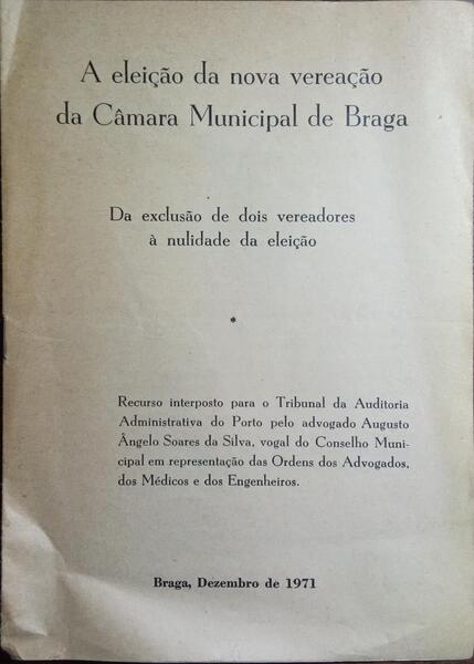 Da exclusão de dois vereadores à nulidade da eleição. Recurso interposto para o Tribunal da Auditoria Administrativa do Porto pelo advogado Augusto Ângelo Soares da Silva, vogal do Conselho Municipal em representação das Ordens dos Advogados, dos Médicos e dos Engenheiros. Edição do autor. Braga. 1971.