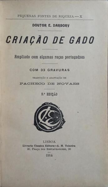 Clique nas imagens para aumentar. DARBORY. (E.) CRIAÇÃO DE GADO.Ampliado com algumas raças Portuguêsas. [Por] Doutor... Com 33 gravuras. Tradução e adaptação de Pacheco de Novaes. 2.ª Edição. Pequenas Fontes de Riqueza, X. Livraria Clássica Editora - A. M. Teixeira. Lisboa. 1914. De 18x11 cm. Com 218 págs. Encadernação do editor. Ilustrado no texto com gravuras. Referência: 2509DG303