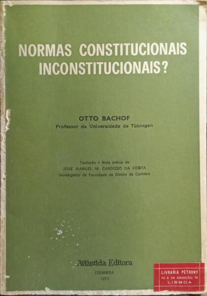 Clique nas imagens para aumentar. BACHOF. (Otto) NORMAS CONSTITUCIONAIS, INCONSTITUCIONAIS?[Por]..., Professor da Universidade de Tübingen. Tradução e Nota prévia de José Manuel M. Cardoso da Costa, Investigador da Faculdade de Direito de Coimbra. Atlântida Editora. Coimbra. 1977. De 22x15 cm. Com xiv, 92, [i] págs. Brochado. Exemplar com capas manuseadas e etiqueta da Livraria Petrony na capa anterior e assinatura de posse na folha de rosto.