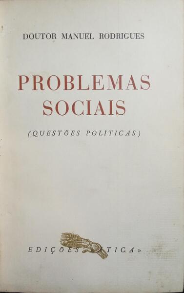 Clique nas imagens para aumentar. RODRIGUES. (Manuel) PROBLEMAS SOCIAIS.Questões Políticas. [Por] Douor... Edições «Ática». Lisboa. 1943. De 20,5x13,5 cm. Com 342, [i] págs. Encadernação da época com lombada e cantos em pele com ferros a ouro. Pastas e folhas de guarda em papel decorativo, corte das folhas carminado à cabeça e inclui uma fita em tira de cetim. Preserva as capas de brochura. Exemplar com assinatura de posse na folha de rosto. Referência: 2509RS061