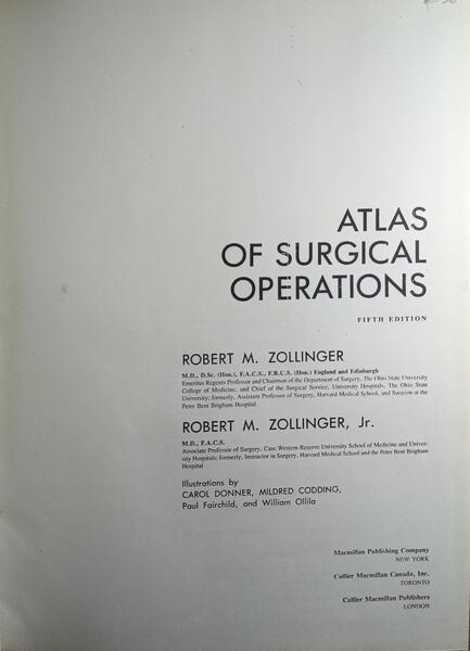 Clique nas imagens para aumentar. ZOLLINGER. (Robert M.)e Robert M. Zollinger Jr. ATLAS OF SURGICAL OPERATIONS.[Por]..., M.D., D.Sc (Hon), F.A.C.S., F.R.C.S. (Hon) England and Edimburgh, [...] e... M.D., F.A.C.S., Associate Professor of Surgery, [...]. Fifth Edition. Illustrations by Carol Donner, Mildred Codding, Paul Fairchild, and William Ollila. Macmillan Publishing Company. Collier Macmillan Canada, Inc. Collier Macmillan Publishers. New York. Toronto. London. 1983. De 36x26 cm. Com x, [i], 436, [i] págs. Encadernação inteira de percalina com ferros a ouro na lombada. Ilustrado no texto com desenhos técnicos. Texto impresso em duas colunas. Referência: 2509RS555