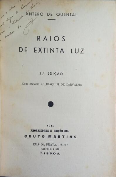 Clique nas imagens para aumentar. QUENTAL. (Antero de) RAIOS DE EXTINTA LUZ. [2.ª EDIÇÃO]Com prefácio de Joaquim de Carvalho. 2.ª Edição. Propriedade e Edição de Couto Martins. Lisboa. 1945. De 21x15 cm. Com 168, [iii] págs. Encadernação do editor. Exemplar com manchas de humidade e assinatura de posse na folha de rosto. Referência: 2511DG159