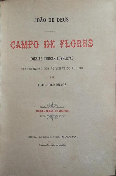 Clique nas imagens para aumentar. DEUS. (João de) CAMPO DE FLORES. [2.ª EDIÇÃO]Poesias Lyricas Completas. Coordenadas sob as vistas do auctor por Theophilo Braga. Segunda edição ne varietur. Imprensa Nacional. Lisboa. M DCCC XCVI [1896]. De 18,5x13 cm. Com xxv, 689, [ii] págs. Encadernação com lombada em pele, nervos e ferros a ouro, folhas de guarda em papel marmoreado e marcador de páginas em fita de cetim. Ilustrado com o retrato do autor e fac-símile de um manuscrito entre as folhas de rosto e anterrosto, sobre papel couché. Exemplar com sinais leves sinais de desgaste na lombada e nas pastas. Referência: 2511MA289