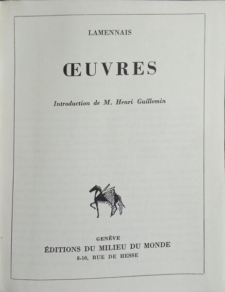 Clique nas imagens para aumentar. ROBERT DE LA MANNAIS. (Félicité) OEUVRES.[Por] Lamennais. Introduction de M. Henri Guillermin. Collection Classique du Mieu du Monde, N.º 15. Éditions du Milieu du Monde. Genéve. [1946]. De 13,5x10,5 cm. Com 577, [v] págs. Encadernação do editor com as pastas flexíveis. Inclui uma fita marcadora em tira de cetim. Data consultada na BNF. Referência: 2511RS106