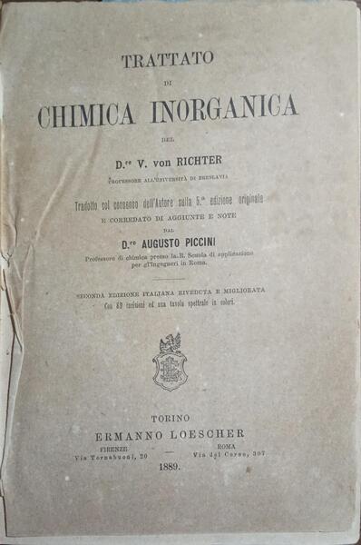 Clique nas imagens para aumentar. VON RICHTER. (Victor) TRATTATO DI CHIMICA INORGANICA.Del D.re... Professore All’Universitá di Breslavia. Tradolto col consenso dell’Autore sulla 5.ª edizione originale e corredato di aggiunte e note dal D.re Augusto Piccini, Professore di chimica presso la R. Scuola di applieazione per gl’Ingegneri in Roma. Seconda Edizione italiana reveduta e migliorata con 89 incisioni ed una tavola spettrele in colori. Ermanno Loescher. Torino. 1889. De 22x15,5 cm. Com xii, 467, [iii] págs. Encadernação em percalina castanha. Ilustrado no texto com desenhos técnicos a preto e branco, e em extratexto com duas tabelas desdobráveis a cores e a preto e branco, nas últimas folhas. Exemplar com danos à cabeça da lombada, e folhas preliminares e finais com danos de manuseamento. Contém nas páginas finais um índice alfabético e uma errata.